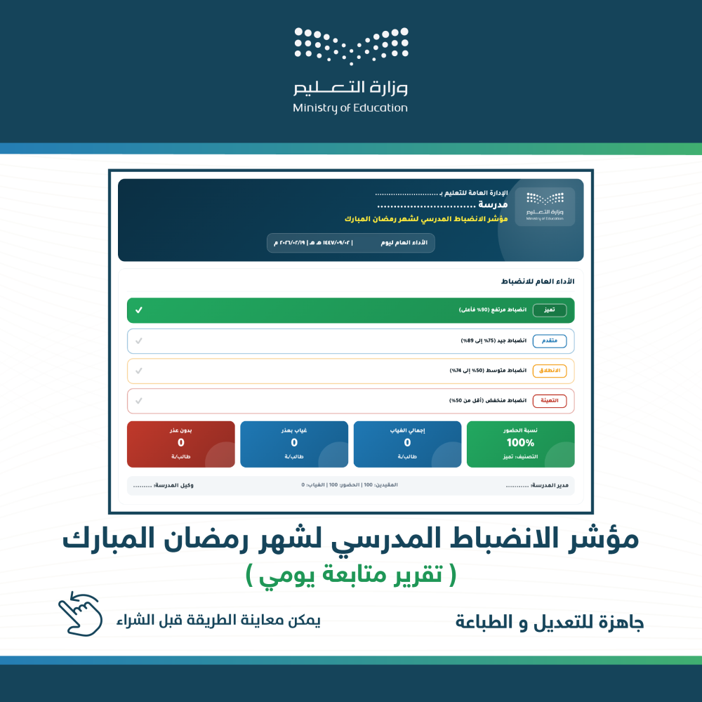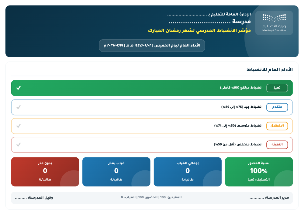 منتج رقمي عملي يساعد المدارس والإدارات التعليمية على تتبع وتحليل الانضباط الطلابي خلال شهر رمضان المبارك بطريقة منظمة وسهلة.